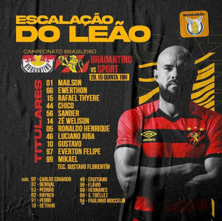 [19/10 ] DÉCIO MEDEIROS: CBF antecipa jogo do Sport contra o Bragantino pela 34ª rodada. O duelo ocorrerá na quinta-feira da próxima semana, dia 28, em Bragança Paulista, às 19h00. O jogo foi antecipado porque a data prevista anteriormente coincidia com o jogo do Bragantino contra o Athletico Paranaense pela final da Copa Sul-americana em Montevidéu, no Uruguai.